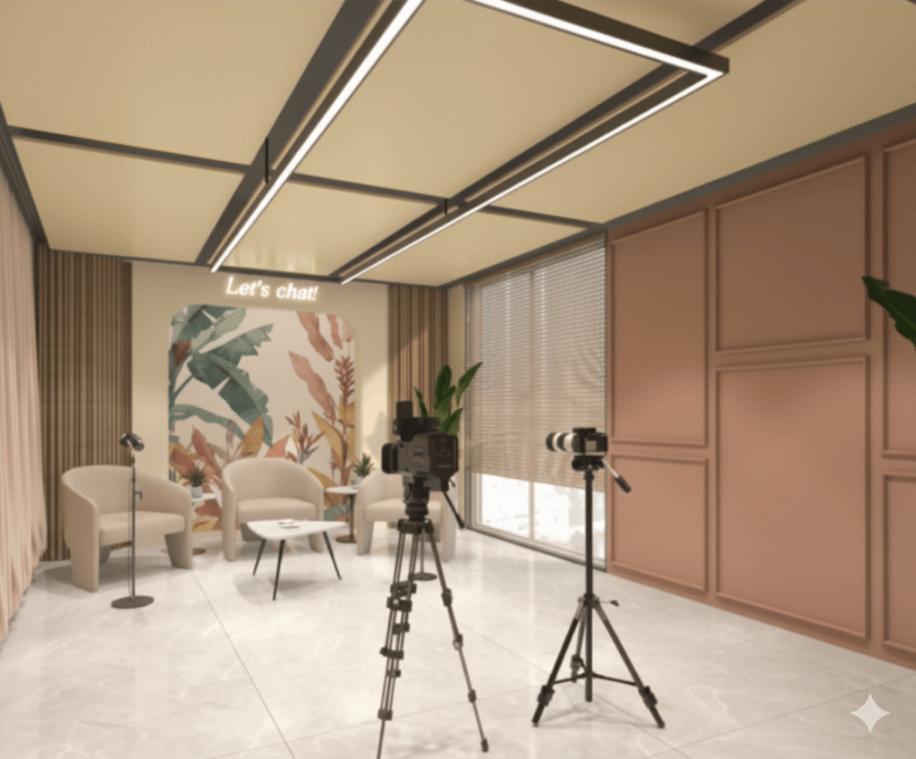 A dark green studio for 2–3 guests with a light-up arch and customizable setups elegant, intimate, and made to fit your vision.